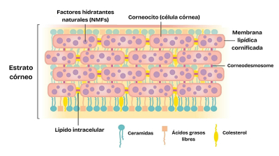 La barrera cutánea constituye la capa más externa de la epidermis y se configura como una estructura compleja y esencial para la salud de la piel. Está compuesta por corneocitos, células muertas que se disponen de forma ordenada, inmersos en una matriz lipídica en la que destacan las ceramidas, el colesterol y los ácidos grasos libres (Figura 1). Esta combinación de células y lípidos crea una red organizada que actúa como un filtro semipermeable, permitiendo la retención de humedad y, al mismo tiempo, impidiendo la entrada de agentes externos, como patógenos y sustancias irritantes.