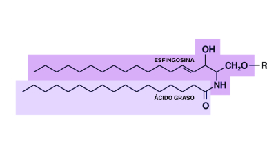 Las ceramidas son moléculas clave dentro de esta matriz lipídica. A nivel molecular, una ceramida está compuesta por una base esfingolípida, que puede ser esfingosina, dihidroesfingosina o fitoesfingosina, unida a un ácido graso mediante un enlace amida (Figura 2). Esta estructura les confiere propiedades anfipáticas que le permiten integrarse de forma ordenada en las bicapas, actuando como la unión que conecta los corneocitos y refuerza la cohesión de la barrera. La capacidad de retener humedad y facilitar la interacción entre otros lípidos es fundamental para preservar la elasticidad y la función protectora de la piel1.