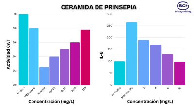 Resultados de estudios in vitro del efecto antioxidante (izquierda) y efecto antiinflamatorio (derecha) de ceramidas de prinsepia. En ambos estudios se miden los resultados respecto un control positivo (vitamina C y LPS, respectivamente) y un control negativo (modelo y DMSO, respectivamente).