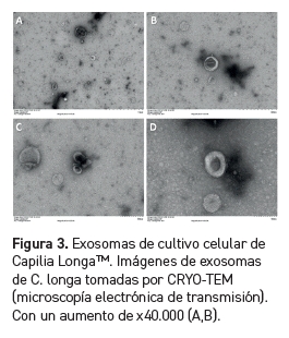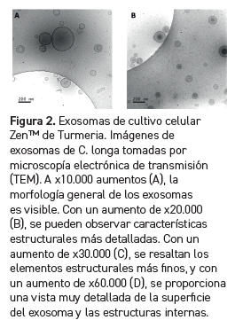 Se utilizaron microscopía electrónica de transmisión (TEM) y crio-TEM para visualizar los exosomas aislados, proporcionando imágenes detalladas de sus estructuras y confirmando su tamaño y morfología. Los exosomas de Curcuma longa, obtenidos bajo las condiciones de producción de Capilia Longa™ y Turmeria Zen™, mostraron vesículas esféricas similares con diámetros promedio ligeramente mayores. Los exosomas de Curcuma longa mostraron vesículas uniformes con una alta concentración, indicativo de un aislamiento exitoso (Figuras 2 y 3). Las imágenes TEM obtenidas para los exosomas de Centella asiática, obtenidas bajo las condiciones de producción de Centella Reversa™, revelaron vesículas esféricas bien definidas con una distribución de tamaño consistente (Figura 4).