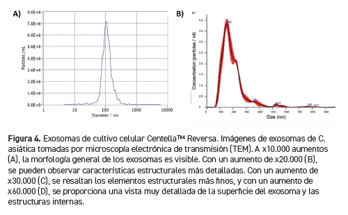 De manera similar, para Centella asiática en la formulación de Centella Reversa, se cuantificó una concentración significativa de exosomas de mil millones por mililitro, exhibiendo un diámetro promedio de más de 100 nanómetros.