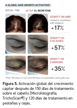 El estudio clínico in vivo evaluó la eficacia regenerativa de un tratamiento destinado a aumentar el crecimiento y la densidad del cabello. El número de pelos presentes por unidad de área se calculó a partir de imágenes del cuero cabelludo tomadas con la microcámara TrichoScan® en T0, T90 y T150. Los resultados se expresaron como el aumento porcentual de la densidad capilar en comparación con la línea de base. El aumento medio de la densidad capilar en un 15,3 % y un 17,3 % a los 90 y 150 días, respectivamente. Además, para la evaluación de la densidad de cejas y pestañas, el secretoma de Curcuma longa aumentó la densidad de las pestañas hasta +200% (3 veces) después de 2 y 4 meses y aumentó la densidad de las cejas hasta +50% (1,5 veces) y +100% (2 veces) después de 2 y 4 meses (Figura 5).