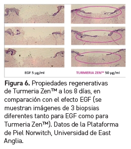 Con el objetivo de evaluar la actividad regenerativa de Turmeria Zen™, se realizó una prueba ex vivo en biopsias con punch (estrés físico significativo) para analizar cómo el activo demostraba propiedades regenerativas en las biopsias con punch (eliminación de la epidermis de 8 mm de diámetro, dejando el círculo interno de 3 mm con epidermis). Después de la aplicación del activo Turmeria ZenTM en los días 0, 3 y 5, las biopsias se analizaron en el día 8. La Fig. 6 muestra que el ingrediente activo tiene una mayor regeneración epidérmica que el factor de crecimiento EGF, así como una mayor redensificación y reestructuración dérmica que el EGF.