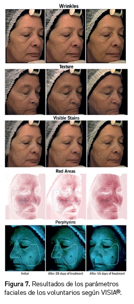Centella Reversa™ redujo significativamente respecto al valor basal a los 28 y 56 días todos los parámetros (Figura 7): arrugas, textura, poros, manchas visibles, zonas rojas y porfirinas.