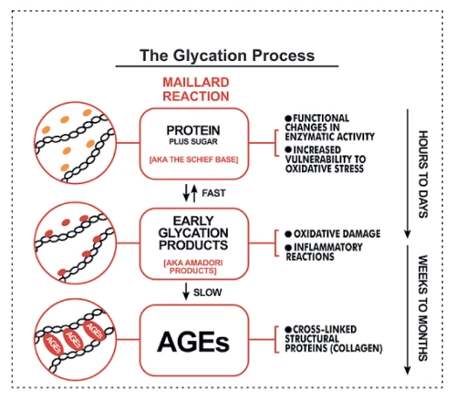 - Altos niveles de azúcares en la sangre. Además de consumir AGEs en nuestra dieta, nuestro cuerpo los produce a diario utilizando los azúcares reductores presentes en la sangre y en los tejidos. Por este motivo los individuos que sufren de Diabetes son particularmente vulnerables a esta reacción.