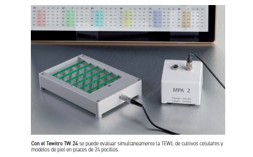 La medición de la TEWL en cultivos celulares en pocillos es otro parámetro importante para evaluar el impacto de los productos para el cuidado de la piel en la hidratación y la integridad de la piel, también para alegaciones de productos como la mejora o el refuerzo de la barrera cutánea. Las sondas monocanal que miden cada pocillo por separado uno tras otro no podrán ofrecer resultados significativos, ya que los cultivos celulares de los distintos pocillos cambiarán rápidamente tras su extracción de la incubadora. Los sistemas multicanal como el Tewitro® TW 24 ofrecen la ventaja de medir todos los pocillos simultáneamente. Es compatible con placas multipocillo estándar de 24 pocillos. Estas placas de pocillos ofrecen 6 filas con 4 pocillos de medición cada una. La sonda se coloca en la parte superior de forma que cada una de sus 24 puntas de medición sobresalga en un pocillo. La punta de medición está equipada con dos pares de sensores que miden continuamente la temperatura y la humedad relativa, captando indirectamente el gradiente de concentración de vapor de agua desde el fondo del pocillo a través del modelo de piel hasta la superficie.