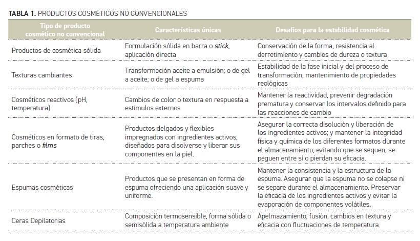 Para comprender mejor la diversidad y complejidad de los productos cosméticos no convencionales, presentamos a continuación una tabla que clasifica varios tipos de estos productos, destacando sus características únicas y los desafíos asociados a su estabilidad: