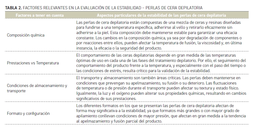La Tabla 2 resume algunos factores relevantes en la evaluación de la estabilidad de las perlas de cera depilatoria.