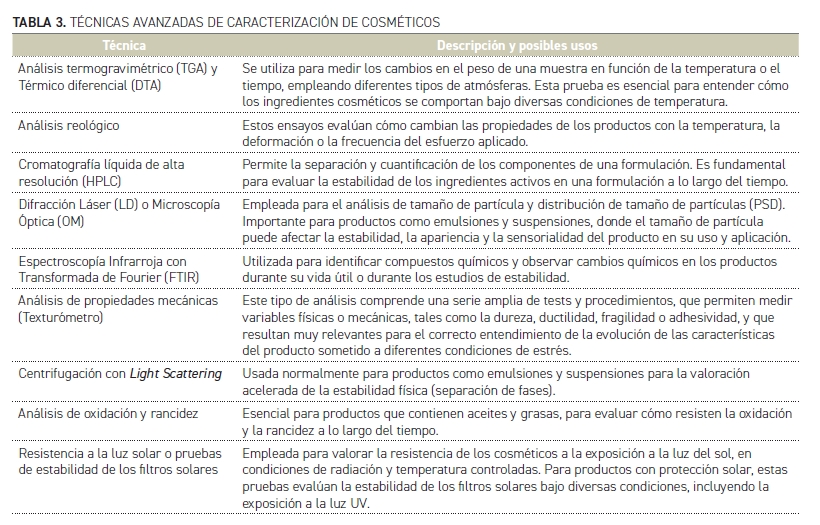 Existen muchas técnicas de análisis ya desarrolladas para el análisis de la composición o de variables físicas, químicas, mecánicas y/o térmicas de productos cosméticos. Estas técnicas se usan normalmente de forma puntual durante el desarrollo de productos, pero no se usan de forma habitual en el seguimiento de las estabilidades, bien sea por su coste o por el tiempo y dedicación que requieren. Pero en el contexto de la cosmética moderna, algunas de estas técnicas pueden ser de gran utilidad para obtener una información precisa, objetiva y rápida de la evolución de ciertos parámetros clave, de esta forma, se puede mejorar y acelerar la determinación de la estabilidad de cosméticos no convencionales.