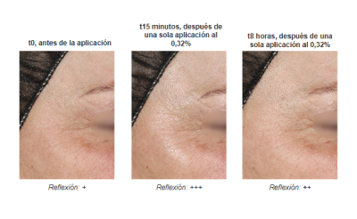 Estos beneficios sobre el microrrelieve y la luminosidad del cutis fueron confirmados por los propios voluntarios a través de evaluaciones subjetivas. La percepción positiva del producto comienza a los 15 minutos después de una única aplicación y se mantiene durante todo el día. De hecho, 8 horas después de la aplicación, el 79% de los sujetos declararon que su piel estaba más lisa, el 63% la encontró más atractiva y el 68% más luminosa (en comparación con el 3 %, el 22% y el 28 %, respectivamente, de los voluntarios que habían utilizado la fórmula placebo).