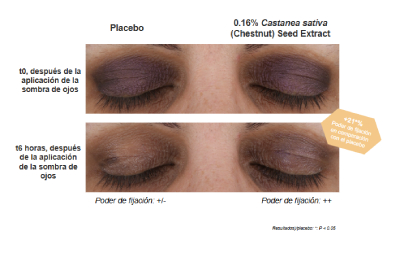 El Castanea sativa (Chestnut) Seed Extract también ha demostrado su eficacia en la categoría del maquillaje. Su efecto perfeccionador del maquillaje se determinó analizando el poder de fijación de una sombra de ojos y una base de maquillaje en voluntarias caucásicas mediante fotografías digitales (la fijación de la base de maquillaje también se demostró en voluntarias asiáticas). El ingrediente activo filmógeno se formuló al 0,16% en una prebase o una base de maquillaje y se comparó con las respectivas fórmulas placebo.