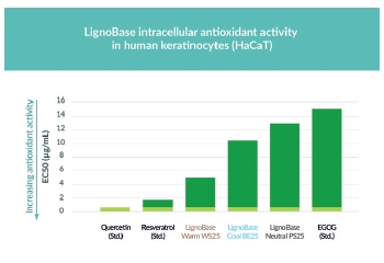 La actividad antioxidante de LignoBase en las células cutáneas se midió en queratinocitos humanos (HaCaT), la neutralización de las especies reactivas del oxígeno (ROS) intracelulares, incluidas las especies radicales libres anión superóxido (O2--) y radical hidroxilo (OH-), generadas por un proceso de fotoinducción. Los resultados mostraron que LignoBase tuvo un efecto antioxidante completo en queratinocitos humanos, siendo competitivo con el galato de epigalocatequina estándar.
