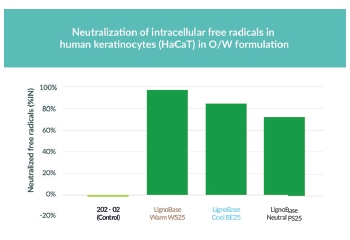 Además, con la adición de un 5% de LignoBase, una crema O/W normal neutralizó el 70-98% de los radicales libres intracelulares producidos por queratinocitos humanos en cultivo.
