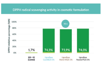 La actividad antioxidante de LignoBase en la formulación se confirmó mediante una prueba de eliminación de radicales DPPH. Según la prueba de eliminación del radical DPPH, los tres tipos de LignoBase aumentaron la actividad antioxidante de una crema O/W multifuncional que contenía un 5% de LignoBase hasta 43 veces en comparación con el control.