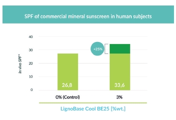 Sumado a esto, se confirmó el factor de fotoprotección de un protector solar mineral que contiene LignoBase Cool BE25 en un panel de 13 sujetos humanos sanos tras su aplicación en condiciones controladas utilizando el método no invasivo LED HDRS. Este estudio demostró que la incorporación de un 3% de LignoBase Cool BE25 aumentó significativamente el FPS de un protector solar comercial de base mineral en un 25% en sujetos humanos.