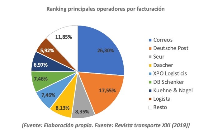 Respecto al ranking por operadores, Correos se sitúa en el primer puesto tanto como principal operador logístico por facturación como por volumen. Sobre los diez principales operadores, Correos se hace con el 26,30 % de la facturación seguido por Deutsche Post (17,55%) y Seur (8,35%), XPO Logistics en la posición quinta (7,46 %) y Logista (5,92 %) en séptimo lugar.