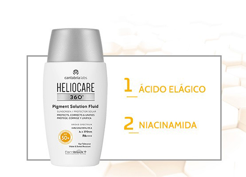 Heliocare 360 Pigment Solution Fluid SPF 50+ actúa en varios niveles y consigue que la actividad despigmentante sea más eficaz gracias a dos ingredientes: la niacinamida y el ácido elágico.