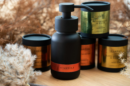 La oferta de lanzamiento de Careli Cosmetics se presenta en un estuche que contiene dos cápsulas de jabón concentrado y una elegante botella dosificadora espumante, que se puede reutilizar todas las veces que sea necesario añadiendo solo agua y nuevas cápsulas Careli Cosmetics.