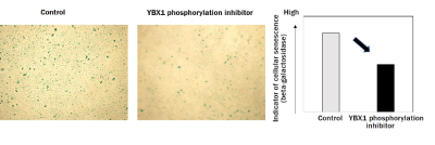 En este estudio, el equipo del Profesor Asociado Mandinova del CBRC y Shiseido revelaron que la fosforilación de YBX1 observada en muchas de las células madre epidérmicas recogidas de donantes de distintas edades mostraba una función reducida. Además, cuando se añadió un fármaco que inhibe la fosforilación de YBX1 a las células cultivadas que contenían células madre epidérmicas y se tiñó con beta-galactosidasa (beta-Gal), un indicador de la senescencia celular (Figura 2, izquierda, azul) para comparar sus cantidades (Figura 2, derecha), los resultados indicaron un efecto supresor del fármaco sobre la senescencia celular.