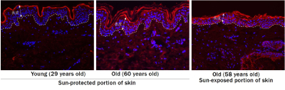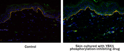 En la piel humana real, se observó una disminución de las células YBX1-positivas con una reducción de las células madre epidérmicas debido al envejecimiento o a la influencia de la exposición a la luz solar. Por otra parte, en comparación con la parte de la piel que no estaba expuesta a la luz solar (parte protegida del sol), la parte de la piel expuesta a la luz solar (parte expuesta al sol) presentaba un nivel significativamente mayor de YBX1 fosforilado (Figura 3). Estos resultados sugieren que los cambios en la piel causados por la exposición a la luz solar durante periodos prolongados, es decir, el fotoenvejecimiento, pueden ser un factor que contribuya a la fosforilación de YBX1.