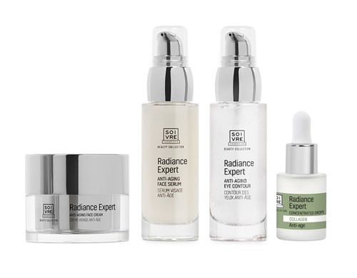 Para este tipo de pieles, Soivre Cosmetics ofrece la línea Radiance Expert Antiage, compuesta por una rutina intensiva de 3 productos de día y noche: crema facial, sérum y contorno de ojos.