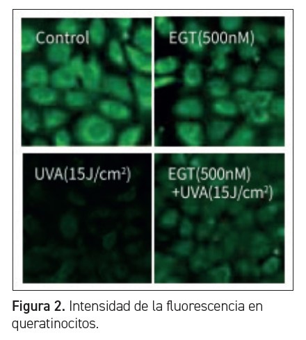 LAS MITOCONDRIAS SON ORGÁNULOS DINÁMICOS que se encuentran en las células de animales y plantas. Se conocen como las centrales de energía de las células y producen adenosin trifosfato o ATP para el funcionamiento correcto del organismo. Puesto que son una fuente importante de ROS, las mitocondrias son más vulnerables al ataque de ROS y el daño oxidativo asociado al ADN y la estructura de la membrana9. Los científicos examinaron el daño mitocondrial producido por la radiación UVA en las células HaCaT utilizando un ensayo de Mito-Tracker, y descubrieron que las células irradiadas con UVA con tinción de Mito-Tracker mostraron una intensidad de fluorescencia significativamente menor, lo que revela el potencial incomparable de la membrana mitocondrial en queratinocitos. El tratamiento previo con BioyouthTM-EGT Pro. (500 nM) previno la pérdida potencial de membrana provocada por la radiación UVA, lo que significaba que la EGT podía contrarrestar el daño mitocondrial producido por la radiación UVA, puesto que las células aparecían con fluorescencia verde10 (figura 2).