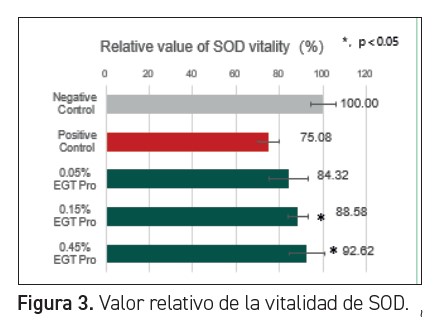 El superóxido dismutasa (SOD) es un importante agente que elimina los radicales libres de aniones superóxido en los organismos. En particular, puede eliminar los radicales libres de aniones superóxido que se generan en el proceso biológico de oxidación y ayuda a retrasar el envejecimiento. Por consiguiente, el SOD se considera una sustancia importante del sistema de defensa antioxidante de la célula. La inmunogenicidad, inestabilidad, inactivación y corta semivida del SOD limitan su aplicación clínica y en el cuidado de la piel. En nuestro estudio, el H2O2 inhibe la actividad del SOD en los fibroblastos humanos. Un 0,45 % de Bioyouth-EGT Pro pudo aumentar la actividad del SOD en un 23 % en comparación con el grupo de control positivo (figura 3).