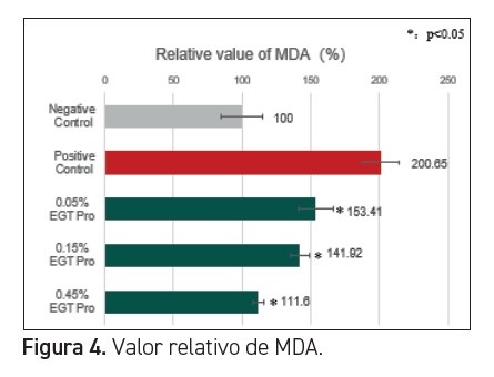 La peroxidación lipídica (Lipid peroxidation, LPO) es la degradación oxidativa de los lípidos. Se trata del proceso en el que los radicales libres ‘roban’ electrones de los lípidos de las membranas celulares, lo que provoca daños en las células. El maolondialdehído (Malondialdehyde, MDA) es un subproducto de la LPO. En nuestro estudio, el H2O2 estimuló la LPO celular y produjo grandes cantidades de MDA. En comparación con el grupo de control positivo, un 0,45 % de Bioyouth-EGT Pro pudo reducir el contenido de MDA en un 44 % (figura 4).