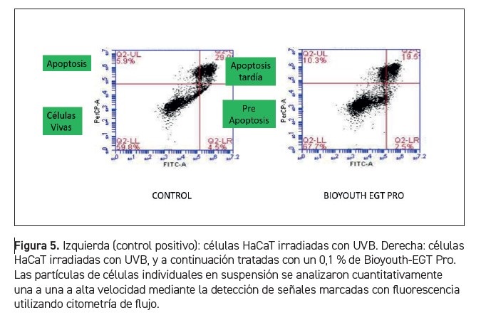 La apoptosis ocurre porque las células sienten estrés o detectan señales como el calor, la radiación y ROS, etc. Otro hallazgo importante de este estudio es que la radiación UV aumenta la apoptosis de células HaCaT. Un 0,1 % de Bioyouth-EGT Pro puede reducir la tasa de apoptosis en un 34 % (figura 5).