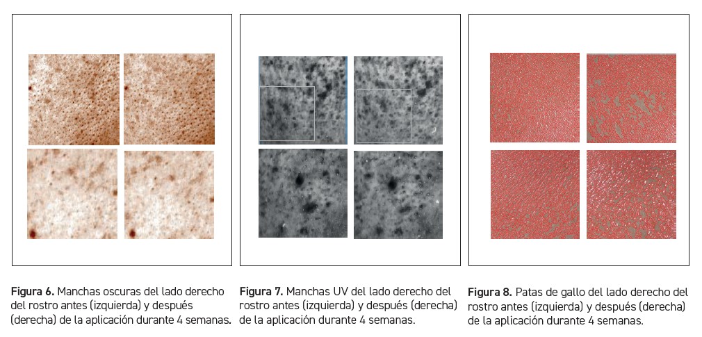 En comparación con el grupo de control, Bioyouth-EGT Pro puede reducir las manchas oscuras en un 10 %, las manchas inducidas por radiaciones UV en un 7 %, las patas de gallo en un 8 %, mejorar la hidratación de la piel en un 15 % y la elasticidad en un 20 % después de su aplicación durante 4 semanas (figuras 6-8).
