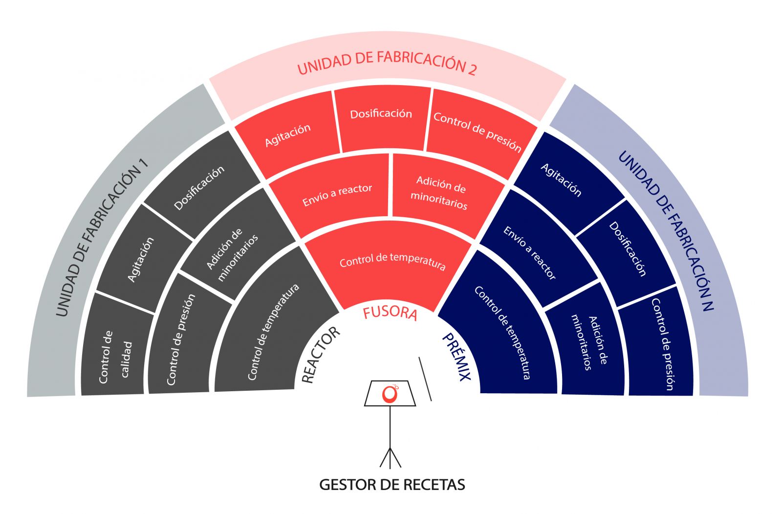 Nos referimos a los reactores, fusoras, depósitos de premezcla, perfectamente equipados con sistemas automatizados de dosificación, de regulación de presión, temperatura y pH, agitadores y emulsionadores. Todo ello gobernado y monitorizado por sus correspondientes PLCs y sistemas SCADA. Sobre esta capa de control de los procesos individuales actuará nuestro gestor de recetas.