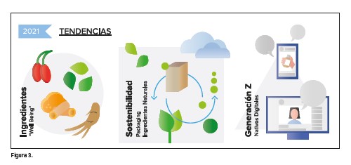 En cuanto a las tendencias globales para 2021, en perfumería fina, según el director de Marketing de Iberchem, Sylvain Massé, “inevitablemente la COVID-19 ha influido en el estado de ánimo global, las marcas van hacia fragancias que mejoren el estado de ánimo. El nuevo claim de la positividad será uno de los que se podrán ver en los próximos meses”. Además, desde el departamento de marketing de Iberchem, también destacan las fragancias con ingredientes que aportan propiedades beneficiosas para el cuerpo: la albahaca, el ginseng, las bayas de goji o la cúrcuma (figura 3).