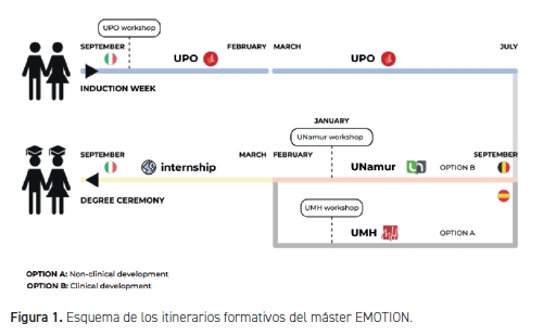 EMOTION es un programa único que abarca todo el espectro de actividades de I+D, desde la ideación hasta la comercialización, pasando por el marketing, los aspectos regulatorios y las más actualizadas técnicas de investigación. El programa formativo se desarrolla durante dos cursos académicos siguiendo el esquema mostrado en la Figura 1. Durante el primer año, los estudiantes reciben formación integral en diferentes aspectos relacionados con la fisiología y cuidado de la piel, así como en química farmacéutica, marketing, estadística, control de calidad y aspectos regulatorios. Este año se desarrolla íntegramente en la UPO y constituye el núcleo básico de formación de todo el alumnado del máster. Una vez finalizado el primer año, los estudiantes deben decidir entre uno de los dos itinerarios posibles, que se desarrollan durante el primer cuatrimestre del segundo año. En la UMH se lleva a cabo el itinerario preclínico mientras que la UNamur cubre el itinerario clínico. De esta manera, en la UMH se cubren aspectos que van desde las técnicas analíticas aplicadas a los productos e ingredientes cosméticos a los ensayos más novedosos y actualizados de caracterización de la actividad biológica, pasando por los ensayos de seguridad y todo lo referente al desarrollo de nuevos productos y modelos de negocio. Todas estas actividades se desarrollan desde un punto de vista eminentemente práctico, en donde las sesiones de estudio de casos y clases prácticas suponen un elevado porcentaje de la carga docente de todas las asignaturas. Por otro lado, el itinerario que se desarrolla en la UNamur está profundamente centrado en la parte clínica, incluyendo formación en ensayos clínicos, su gestión, desarrollo y sus aspectos bioéticos.