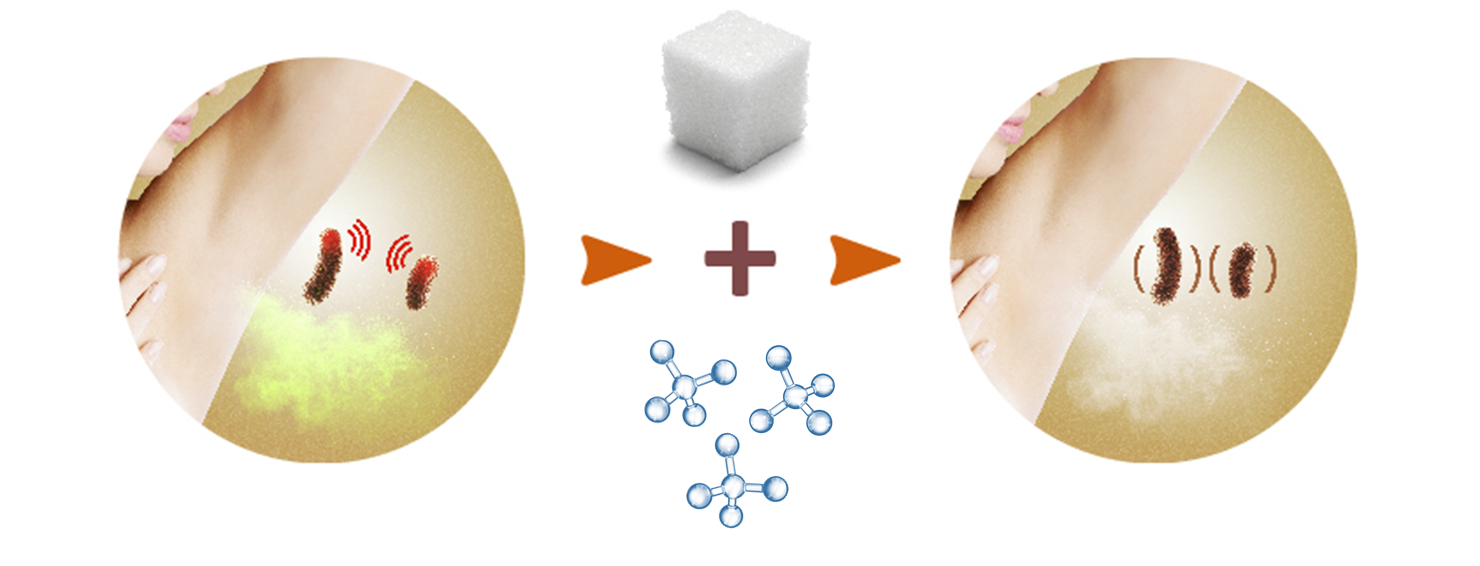 Así, el ingrediente activo sigue una estrategia biológica y una prebiótica que actúan en sinergia contra la formación de moléculas olorosas derivadas de la microbiota comensal de la axila (Figura 1).