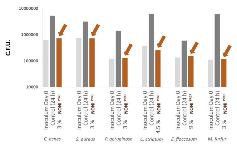 • In vitro 1: Análisis del efecto bacteriostático y fungistático de amplio espectro. En primer lugar, se demostró el efecto bacteriostático y fungistático de amplio espectro mediante la cuantificación de la población microbiana en ausencia y presencia del activo en los medios de cultivos. Se comprobó que hubo variación significativa entre los cultivos sin tratar y los cultivos tratados con el activo tras 24 horas en diversas especies: C. acnes, C. aureus, P. aeruginosa, C. striatum, E. floccosum y M. furfur. El activo mostró un efecto bacteriostático deteniendo el crecimiento de las especies indicadas, pero sin efecto bactericida (Figura 2).