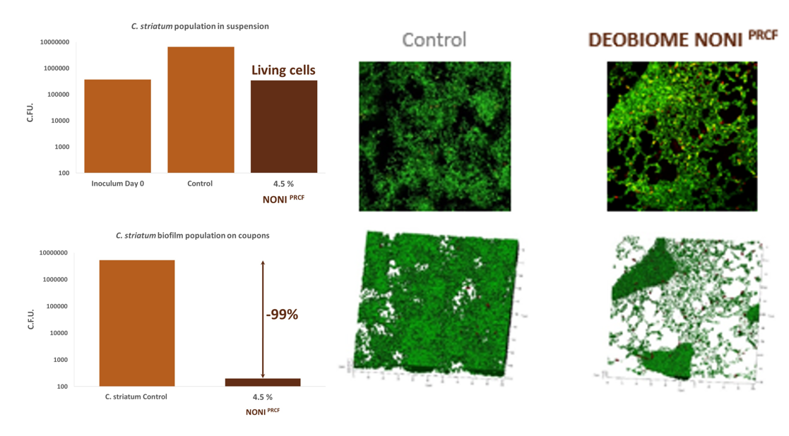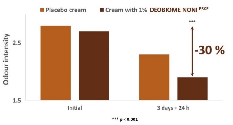El ingrediente activo Deobiome Noni es un innovador tratamiento desodorante respetuoso con la piel y su microbiota. El tratamiento, basado en células madre vegetales, permite la transpiración de la axila a la vez que evita la generación de mal olor, logrando que la piel respire sin alterar el ecosistema biológico.