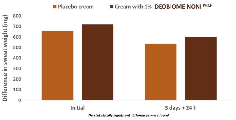 • In vivo 3: Evaluación del índice de transpiración axilar. Por último, se evaluó el índice de transpiración axilar en un panel de voluntarios de entre 28 y 62 años, que aplicaron una crema placebo en una axila y otra crema con un 1% de dosis del activo en la otra. Se mostró cómo no hubo una alteración significativa de la transpiración natural de la axila (Figura 7).