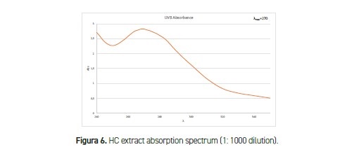 • En este sentido, la actividad de absorción de luz UV del extracto de hamamelis HC está perfectamente adaptada a estas expectativas, con muy buenos valores de absorbancia en el rango espectral considerado (1:1000 dilución):
