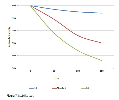 LA ESTABILIDAD VIENE DADA por la presencia mínima de agua que limita los procesos autocatalíticos y aumenta la vida útil del producto. La prueba de estabilidad acelerada a 40ºC se muestra en la figura 7.