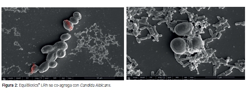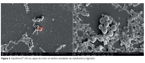 EquiBiotics® LRh tiene la capacidad de establecer un biofilm protector, actuando como una barrera que impide el acceso de Gardnerella vaginalis y Candida albicans al epitelio y su posterior proliferación. (Fig. 3)