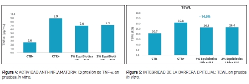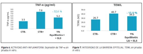 Equibiotics® LA, derivado de Lactobacillus acidophilus a través del proceso de tindalización, ha sido sometido a pruebas exhaustivas, revelando su mecanismo de acción multifacético. Estudios in-vitro en epidermis humana reconstruida EpiDerm™ han demostrado su eficacia en la reducción de la inflamación, particularmente crucial para la piel reactiva. Tras la inflamación inducida por el agente irritante SLS, hubo una disminución notable del 32.6% en los niveles de TNF-α en comparación con el CTRL+. (Fig. 6)