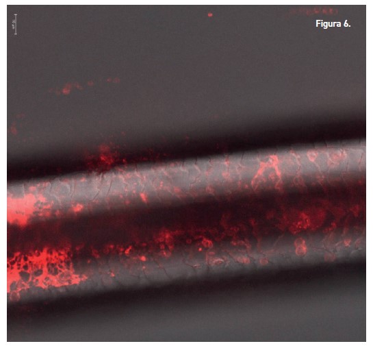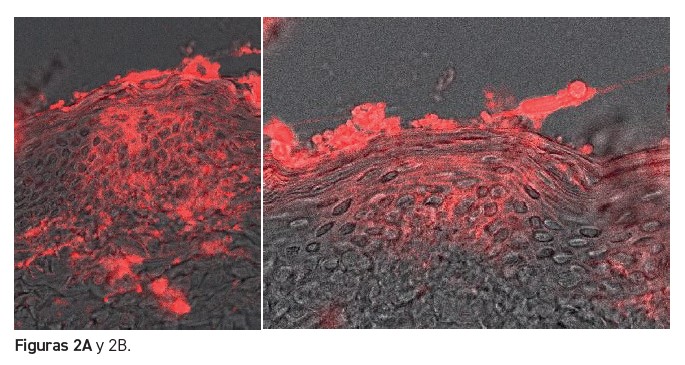 Resultados: Las micrografías (figuras 2A y 2B) muestran cómo las Nanovesículas DDS marcadas con rodamina (en color rojo) logran penetrar hasta los estratos más profundos de la epidermis en una elevada concentración.