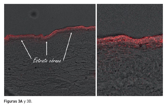 Resultados: Las micrografías (figuras 3A y 3B) muestran cómo las Nanovesículas CDS marcadas con rodamina (en color rojo) logran concentrarse selectivamente en el estrato córneo de la epidermis.