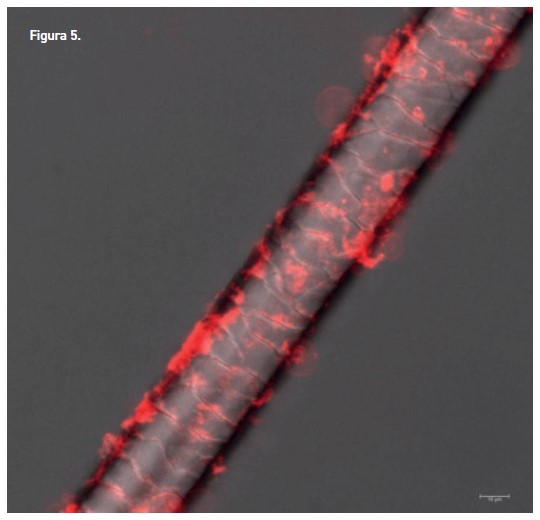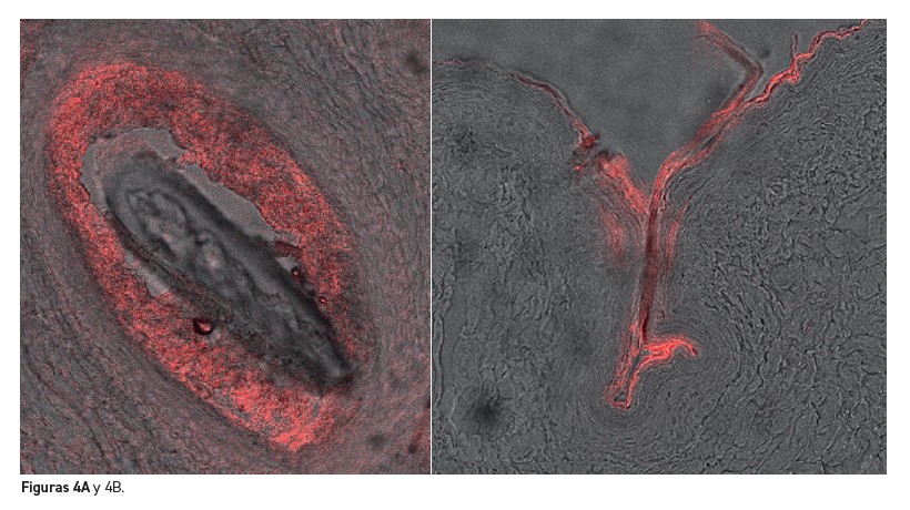 Resultados: Las micrografías (figuras 4A y 4B) muestran cómo las Nanovesículas FDS marcadas con rodamina (en color rojo) logran concentrarse selectivamente en el interior del folículo piloso y su área circundante.