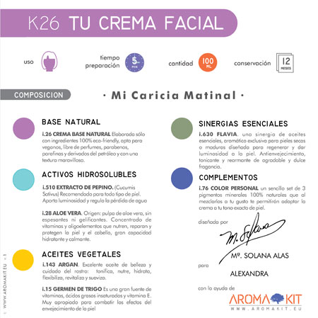El Kit DIY K26, la crema facial personal, se compone de una crema base de 100 ml elaborada exclusivamente con ingredientes naturales y 100% ecofriendly sin ningún derivado animal -cruelty free- apta para veganos y libre de perfumes, parabenos, parafinas y derivados del petróleo u otros productos tóxicos