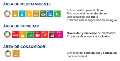 Su agenda de sostenibilidad define siete campos de interés, que se asignan a las áreas de MEDIO AMBIENTE, SOCIEDAD y CONSUMIDOR y que ilustran sus áreas clave de impacto a lo largo de toda la cadena de valor y más allá.