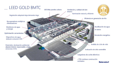 La ampliación de la planta de Beiersdorf Manufacturing Tres Cantos se ha realizado bajo los estándares LEED, un sello de sostenibilidad reconocido internacionalmente para la planificación de edificios, con equipos de alta eficiencia, luz natural, minimización del consumo de agua y producción de energía renovable como la fotovoltaica.