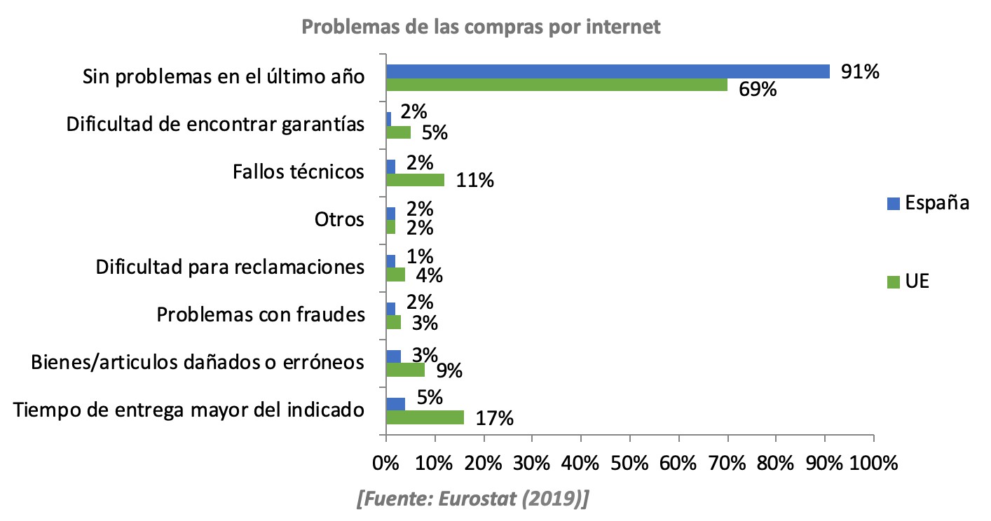 Un 91% de internautas no experimentaron problemas a nivel nacional durante el año 2018, frente al 69% europeo. Señalándose los tiempos de entrega como las incidencias más notorias y, en segundo lugar, los fallos técnicos. Respecto a la recepción de artículos dañados o erróneos, España cuenta con un 6 % menos. En cuanto a los problemas de fraude, nos encontramos en la misma situación que la media europea.