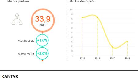Por tipologías de canales, el comercio online sigue creciendo, pero a un ritmo más lento, y alcanza una cuota del 12,3%, lo que supone un crecimiento en valor del 73% versus 2019. La pandemia aceleró el crecimiento natural del ecommerce, sin embargo, durante 2021, hemos visto que ese crecimiento viene del incremento del gasto, pero no de los nuevos compradores.