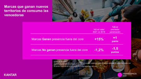 Por este motivo, desde Kantar han constatado, a partir de un estudio realizado con 44 marcas de gran consumo, que las marcas que crecen son las que se expanden en ocasiones de consumo fuera de su actividad principal o core, cubriendo así otras necesidades, motivaciones, momentos o targets. De esta manera, las marcas que ganaron en 2021 nuevos territorios de consumo aumentaron un 15% su valor con respecto a 2019 y, en cuanto al dato promedio de penetración, esta cifra se incrementó en 1 punto. En concreto, el 70% del crecimiento de estas marcas viene explicado por el avance fuera de sus ocasiones core.